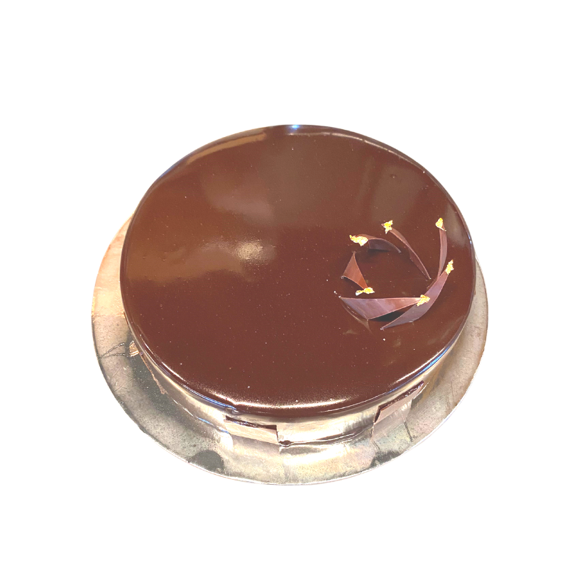 56% chocolate mousse with a caramel Brulee insert sitting on a flourless chocolate sponge, finished off with a dark chocolate glacage.
