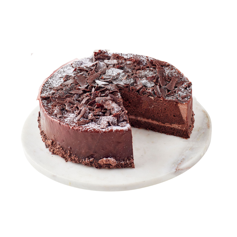 A round chocolate mousse mud cake on a mud cake base. Finished with a chocolate ganache and chocolate curls then sprinkled with dusting sugar.