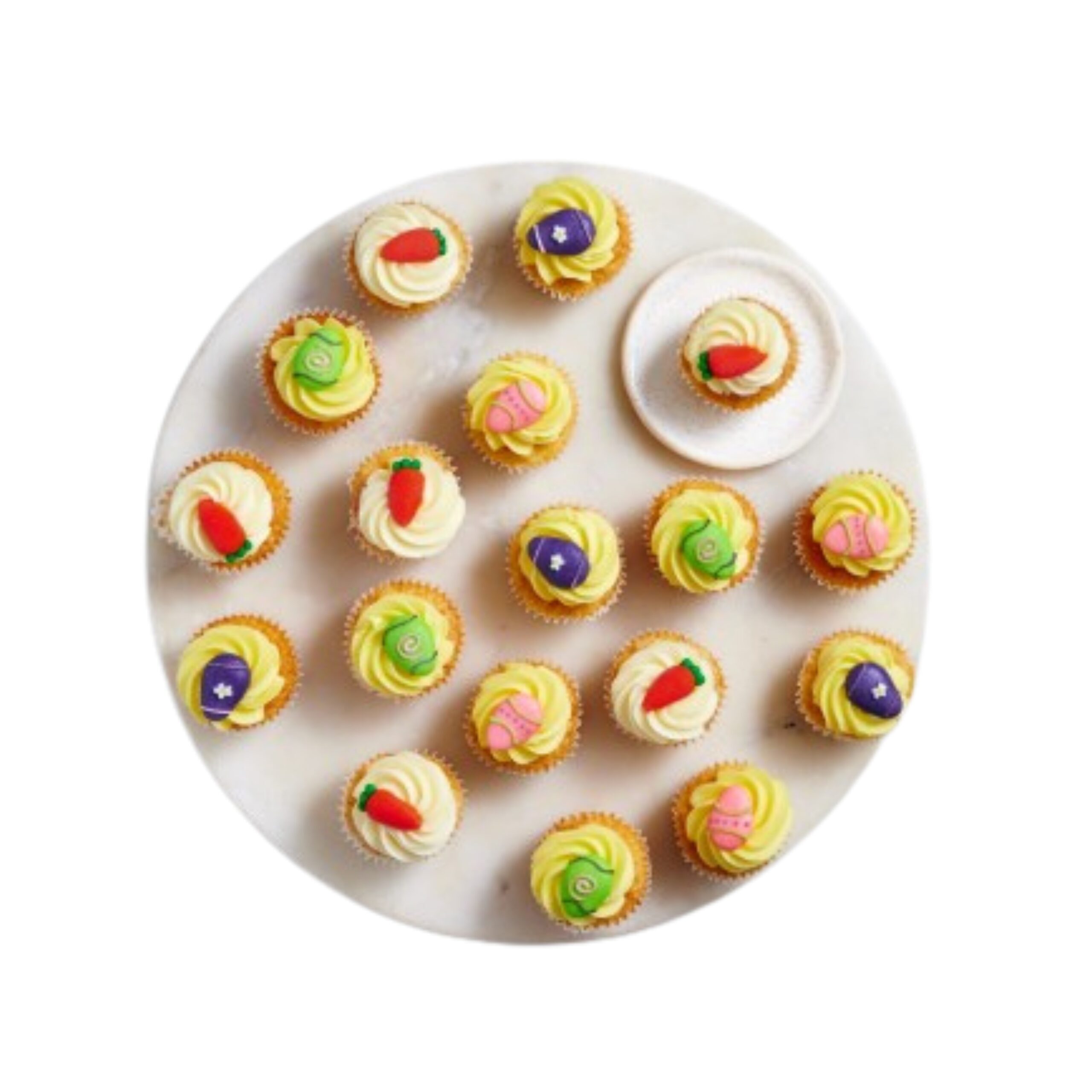 Our GF vanilla babycakes are topped with white and yellow buttercream and finished with festive Easter trinkets. A sweet and charming treat for your Easter celebrations! 🐣💛